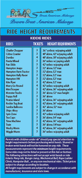 manufacture adjustments, insurance and state laws. The height signs next to the ride take presidence over the information below.