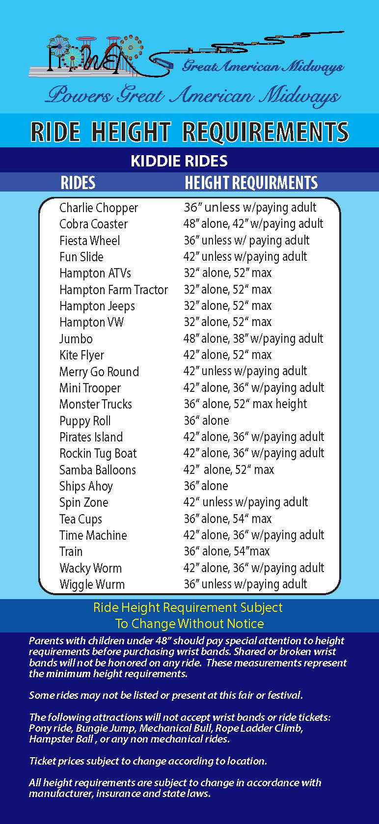 manufacture adjustments, insurance and state laws. The height signs next to the ride take presidence over the information below.